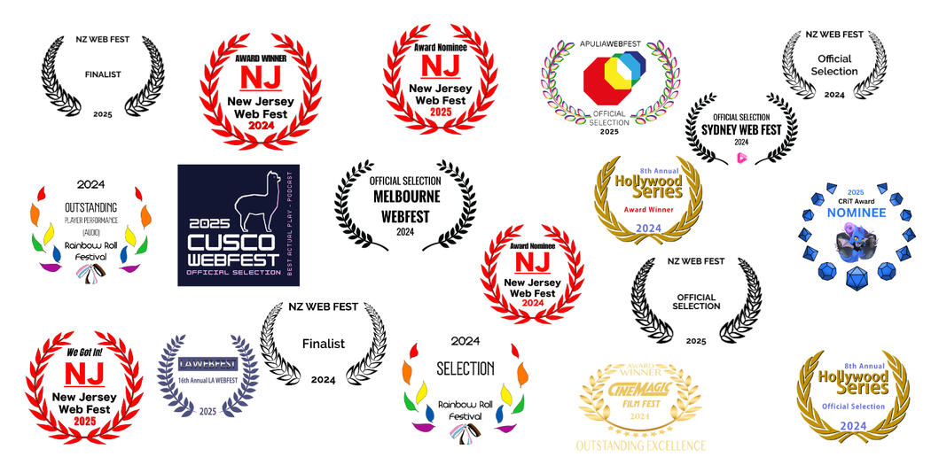 Rahrah has been the sound designer, gm, and producer for Actual Play or Audio Dramas that have earned the following awards or selections:2025:Wins: Updated At the End of the Webfest Season.Nominated: Best AP Podcast LA Webfest, Best Indie Player for Crit Awards, Best Audio and Sound Design in a Podcast for the Crit Awards, Best Creature Artist for the Crit Awards, Best Onepager Game for the Crit Awards (Rahrah), Outstanding Community Member for the Crit Awards (Rahrah), Outstanding Fantasy AP Podcast at the New Jersey Webfest, Best Character Player Performance at the New Jersey Webfest, Best AP Podcast at the New Zealand Webfest, Best Writing in Audio Fiction at the New Zealand Webfest,Selected: New Jersey Webfest, Rainbow Roll Fest, New Zealand Webfest, Apulia Webfest, Cusco Webfest, LA Webfest, Crit Awards.2024:Wins: Best Sound Design for an AP Podcast at New Jersey Webfest, Outstanding Player Performance at Rainbow Roll, Award for Outstanding Excellence in an AP at Cinemagic Webfest, Best Premise in Audio Fiction at the Hollywood Series, Best GM of an AP at the Hollywood Series,Nominations: Best Sound Design for an AP Podcast at New Jersey Webfest, Outstanding Fantasy AP Podcast at New Jersey Webfest, Best Premise of an AP New Jersey Webfest, Outstanding Player Performance at Rainbow Roll, Best AP Podcast New Zealand Webfest, Best Series Podcast Fiction at New Zealand Webfest, Best Writing at New Zealand Webfest, Best Actual Play at the Hollywood Series, Best GM at the Hollywood Series, Best Sound Design in an AP at the Hollywood Series, Best Ensemble Cast at the Hollywood Series, Best Editing in an AP at the Hollywood Series, Best Premise for Audio Fiction at the Hollywood Series, Best Writing in an Audio Fiction at the Hollywood Series, Best Sound Design in Audio Fiction at the Hollywood Series, Best Drama Audio Fiction at the Hollywood Series,Selected: New Jersey Webfest, Hollywood Series, Cinemagic Webfest, New Zealand Webfest, Sydney Webfest, Melbourne Webfest, Rainbow Roll.
